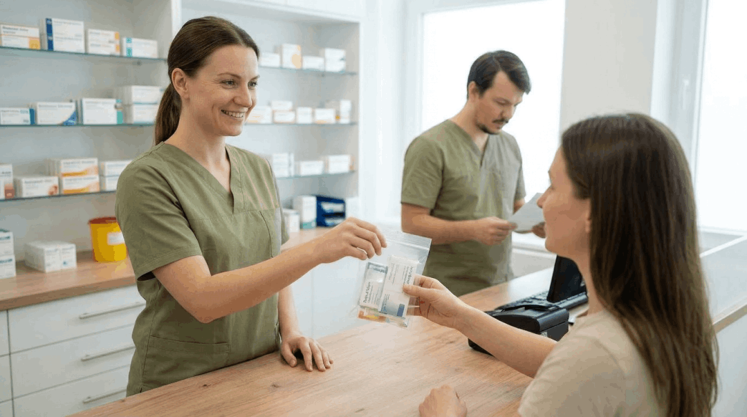 Zusätzlich gibt es bei uns das Medikamentenausgabefenster "MedExpress" an dem Sie ihre vorbestellten Medikamente noch schneller abholen können.